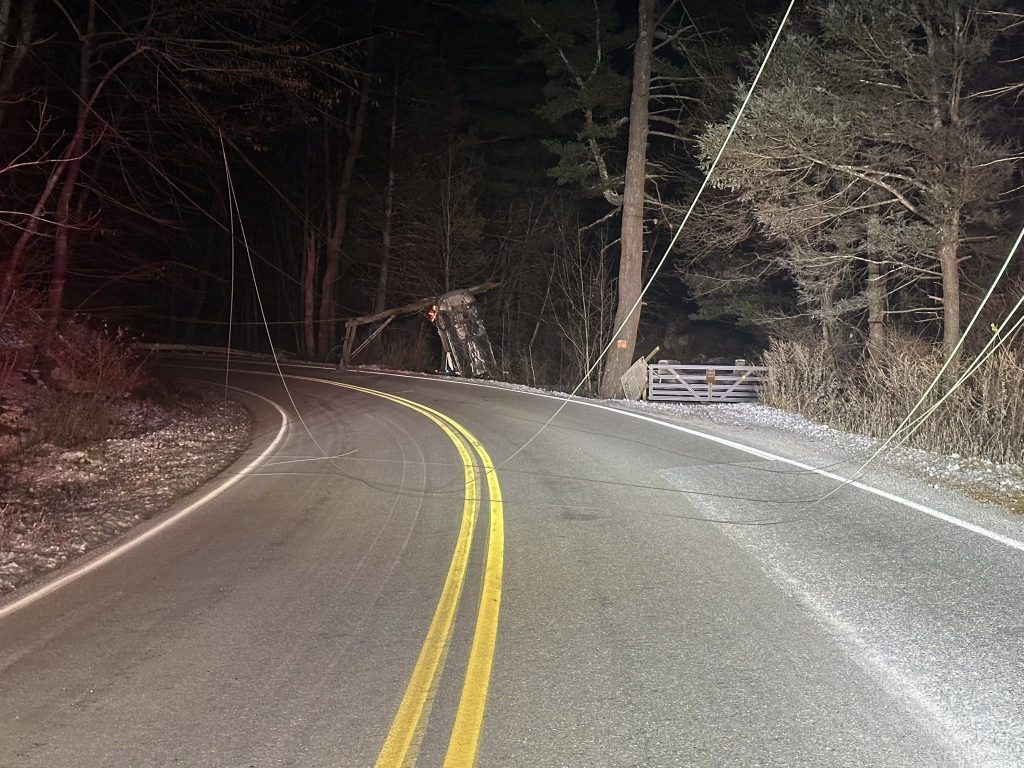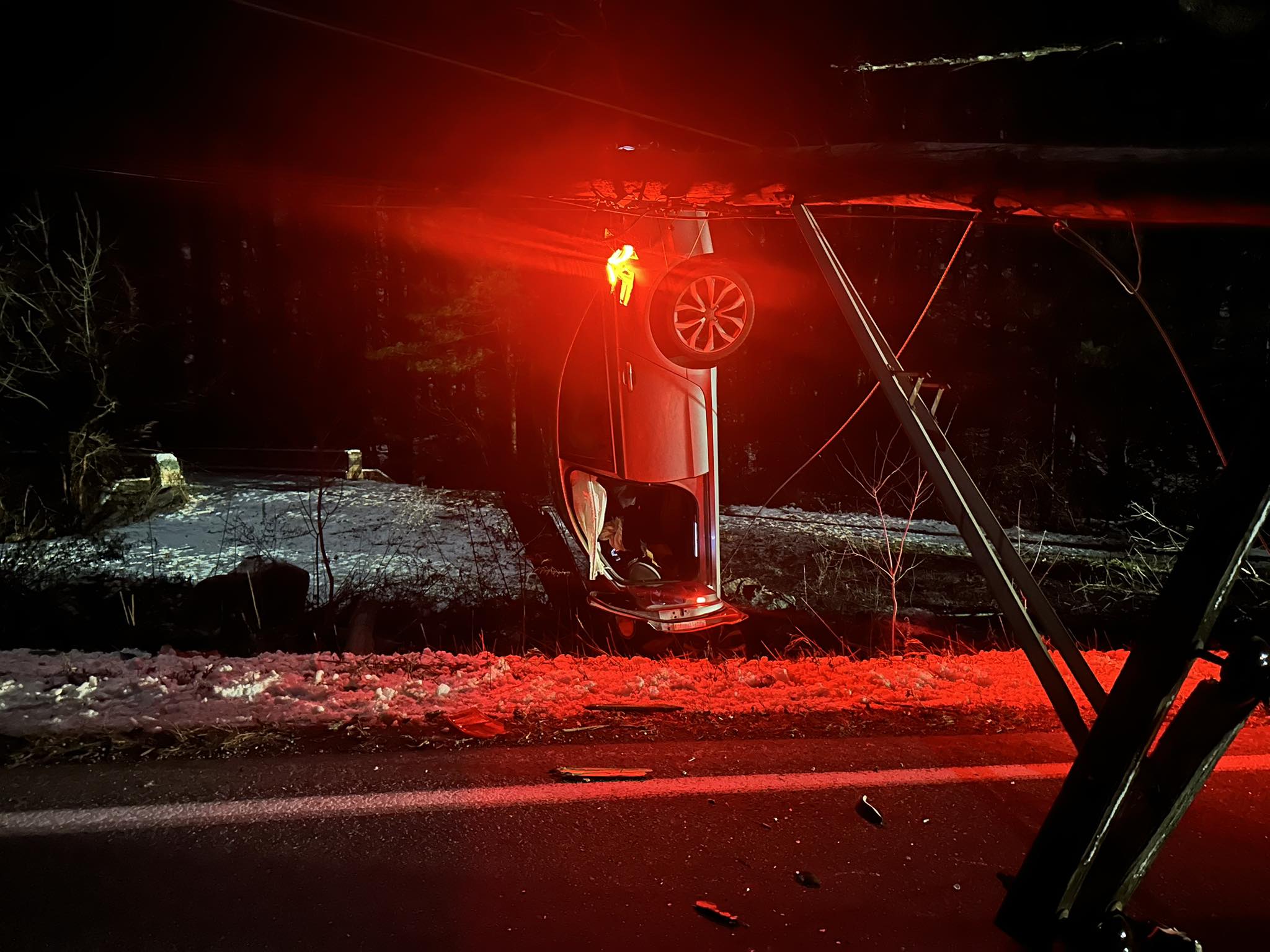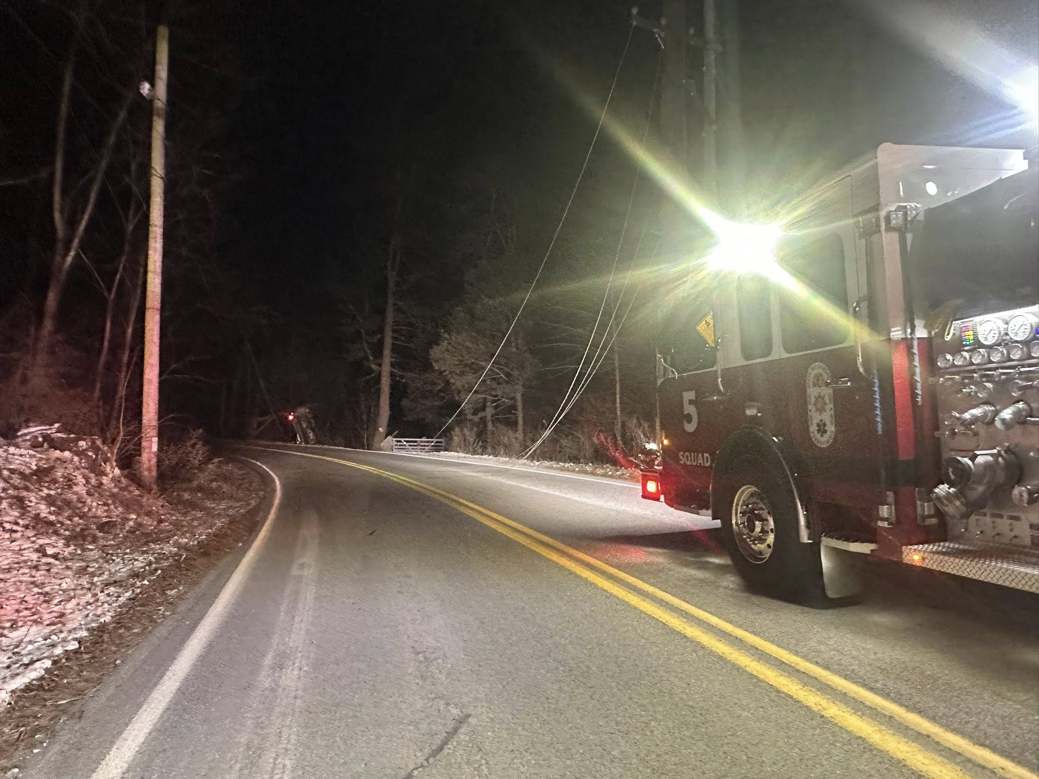 South Units responded to assist Station 8 with a motor vehicle accident, no injuries, wires down. Squad 5 and Car 5/Chief 5 responded. Units arrived on scene to find a single vehicle nose down and rear end straight up into the air resting on a broken pole and guidelines. Crews begin to investigate and determine if the lines were still energized with hot sticks. Driver was located South of the accident with a bystander and uninjured.